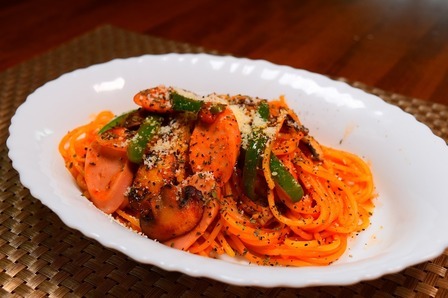 - 茹で上がったスパゲッティーに茹で汁を適量入れ2を加える。混ぜ合わせたらケチャップを入れ再度炒める。ケチャップが馴染んだら、バターを全体に絡めて出来上がり。
