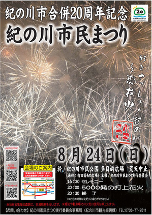 紀の川市の夏の風物詩のひとつ、花火をメインとしたお祭りです。紀の川市民まつり実行委員会では、「みんなでやろらよ」を合言葉に、市民が自分たちで考え、自分たちで行う市民総参加型の夏まつりをめざしています。5,000発の打上花火をメインに、もりだくさんの催物を計画し、市民の皆様に愛されるまつりを目指しています。